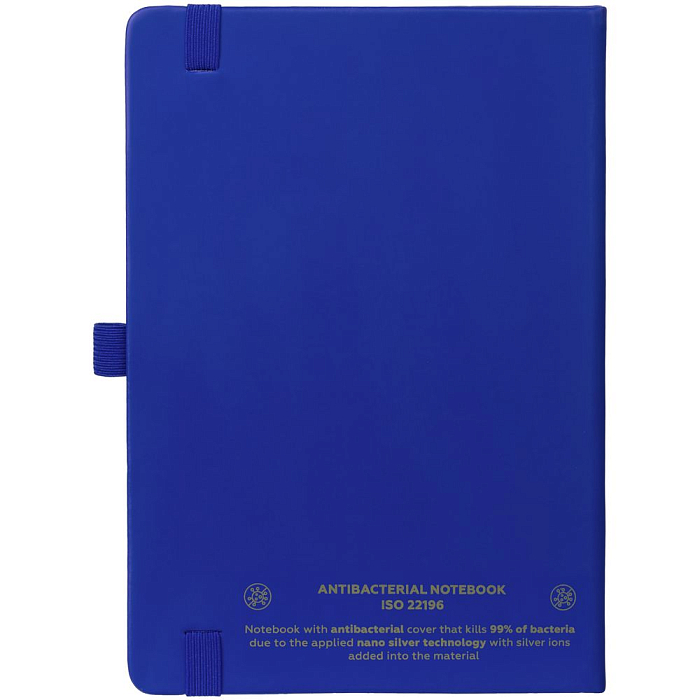 Блокнот в твердой обложке с антибактериальным покрытием, дополнен ляссе, резинкой и петлей-резинкой в цвет обложки.