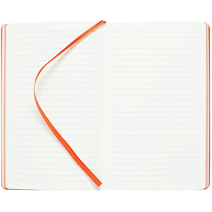 Блокнот в твердой обложке, выполнен из материала Soft Touch, оранжевый ОО, дополнен резинкой и ляссе в цвет обложки.