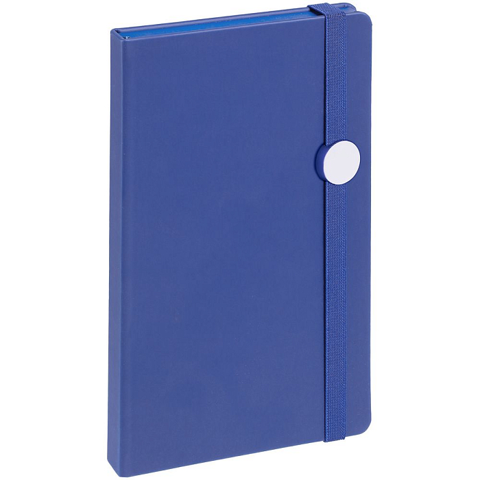 Блокнот в твердой обложке, выполнен из материала Soft Touch Pearl, синий НН, дополнен резинкой и ляссе в цвет обложки.