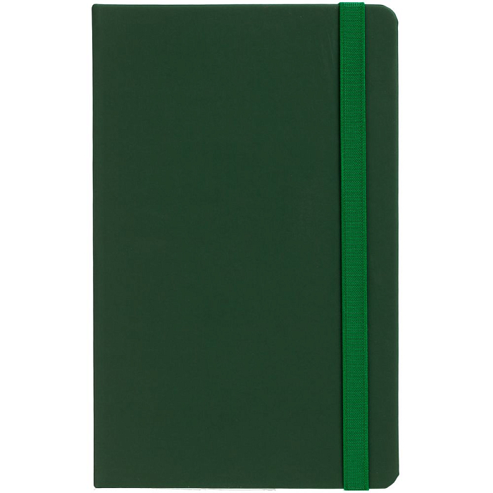 Блокнот в твердой обложке, выполнен из материала Soft Touch, зеленый FF, дополнен резинкой и ляссе в цвет обложки.