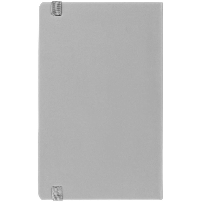 Блокнот в твердой обложке, выполнен из материала Soft Touch, серый СС, дополнен резинкой и ляссе в цвет обложки.