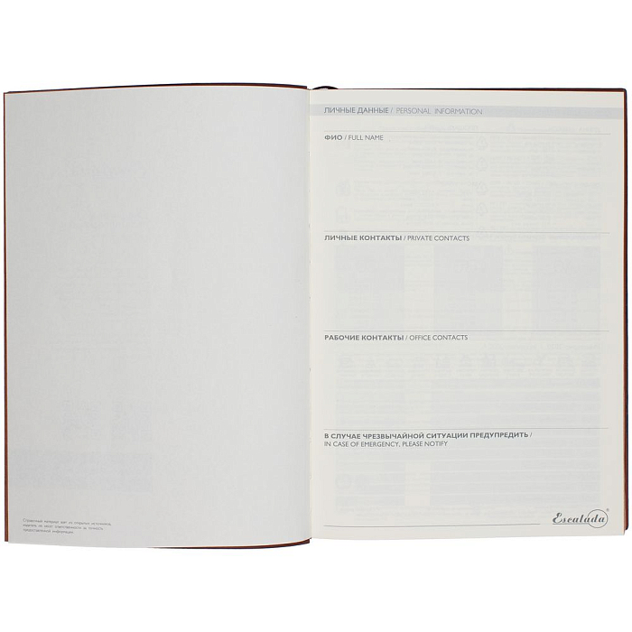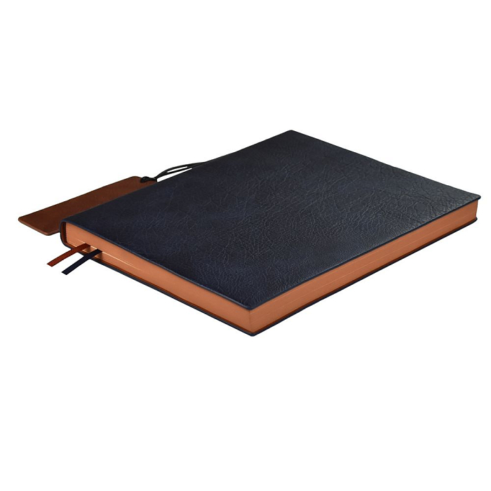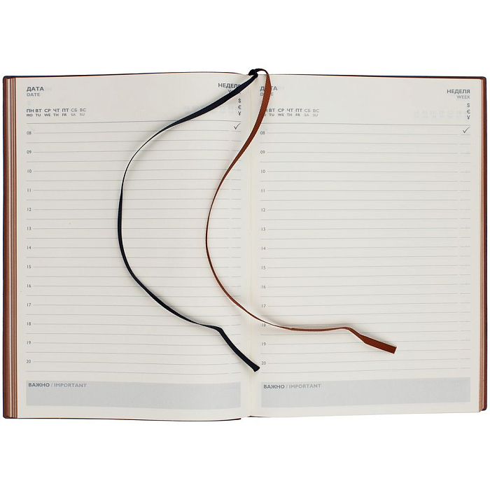 Ежедневник с гибкой обложкой и закладкой из искусственной кожи, дополнен капталом и двойным ляссе.