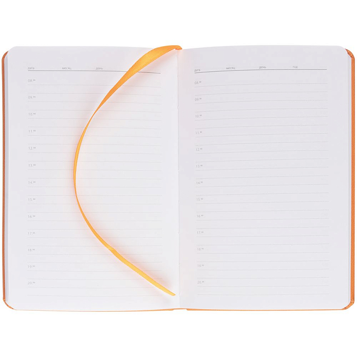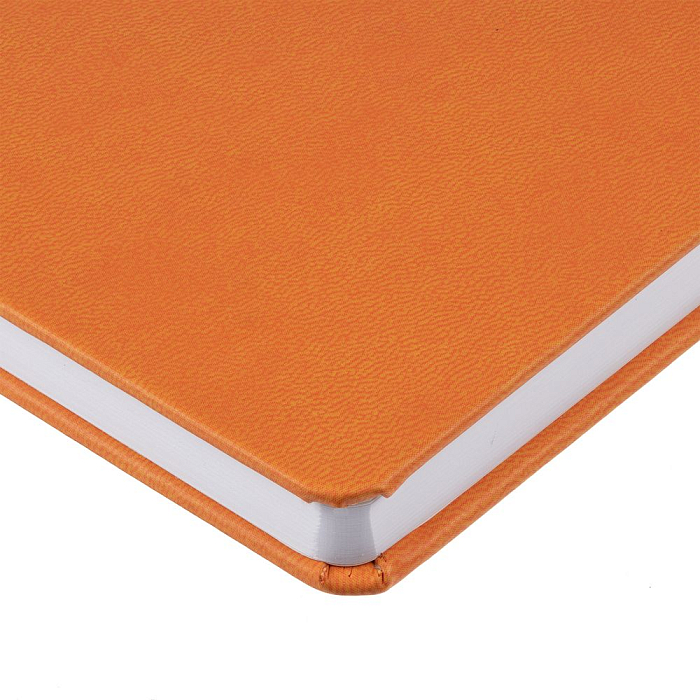 Ежедневник с твердой обложкой, выполнен из материала Latte, оранжевый ОО, дополнен ляссе в цвет обложки.
