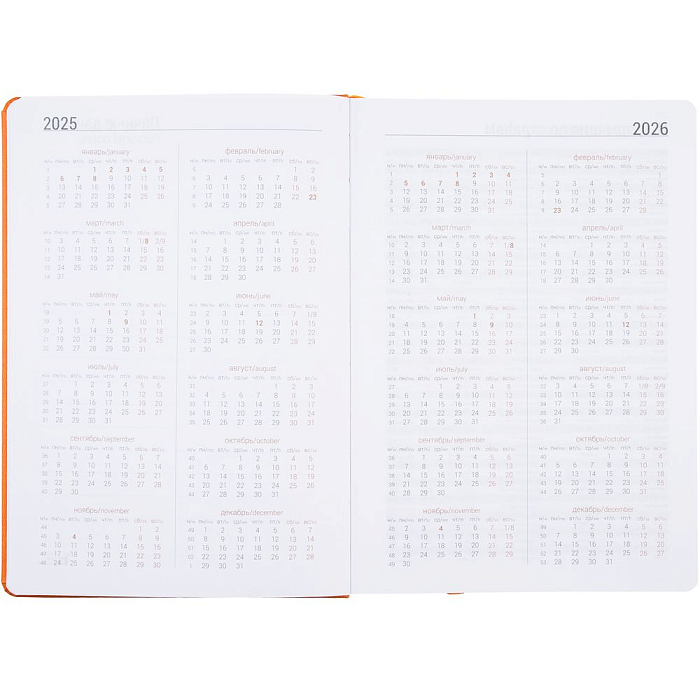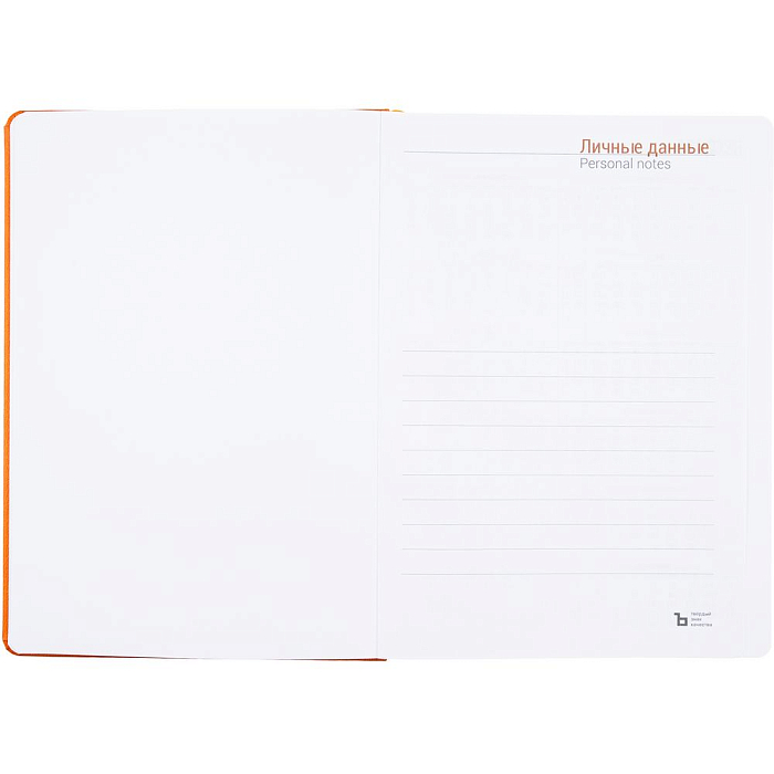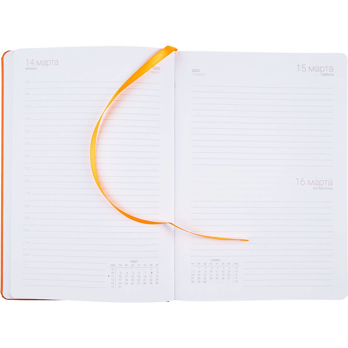 Ежедневник с твердой обложкой, выполнен из материала Latte, оранжевый ОО, дополнен ляссе в цвет обложки.