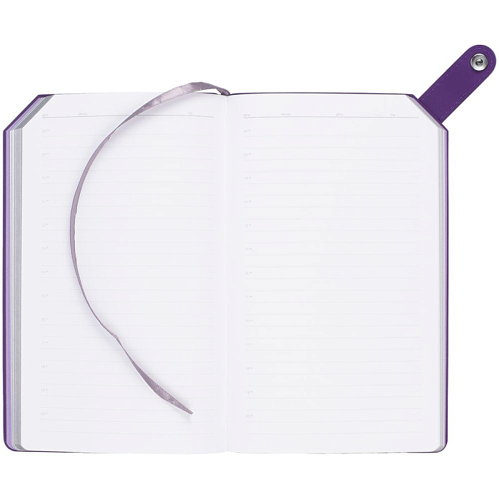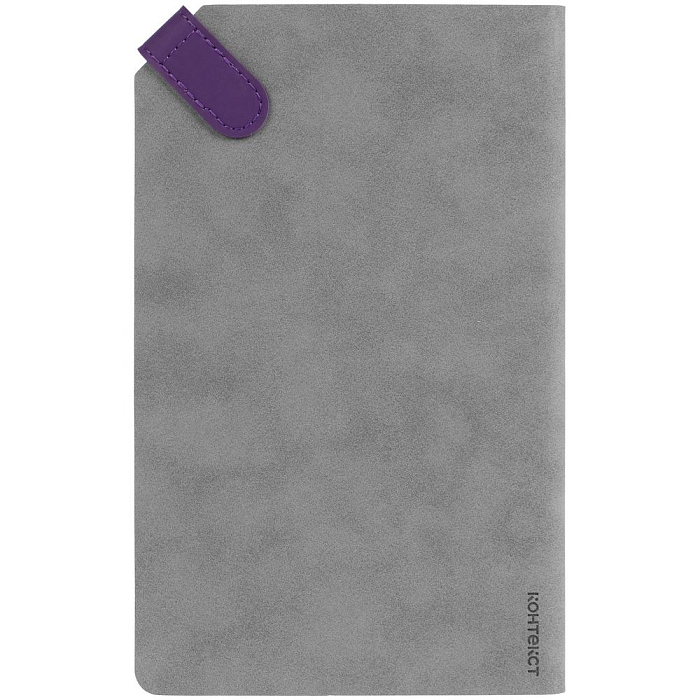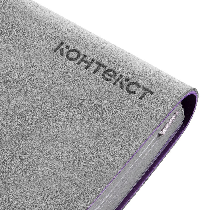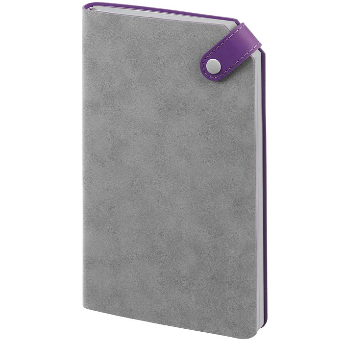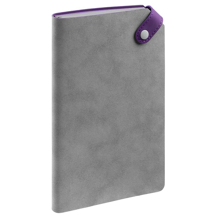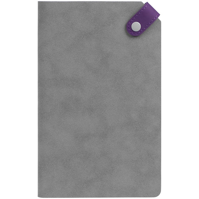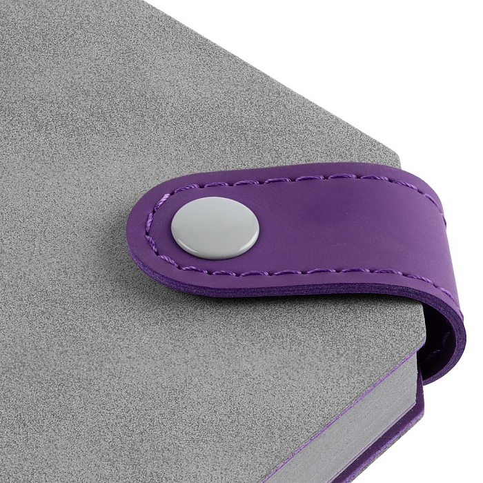 Ежедневник с гибкой обложкой, выполнен из материала Nubuck, серый СС и Soft Touch, фиолетовый, дополнен серым ляссе и хлястиком на кнопке.
