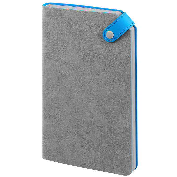 Ежедневник с гибкой обложкой, выполнен из материала Nubuck, серый СС и Soft Touch Ultra, голубой, дополнен серым ляссе и хлястиком на кнопке.