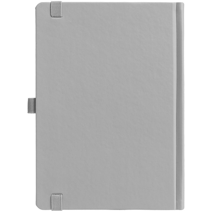 Ежедневник с твердой обложкой без поролона, выполнен из материала Soft Touch, серый СС, дополнен резинкой шириной 1 см, петлей-резинкой для ручки, капталом и ляссе серого цвета.