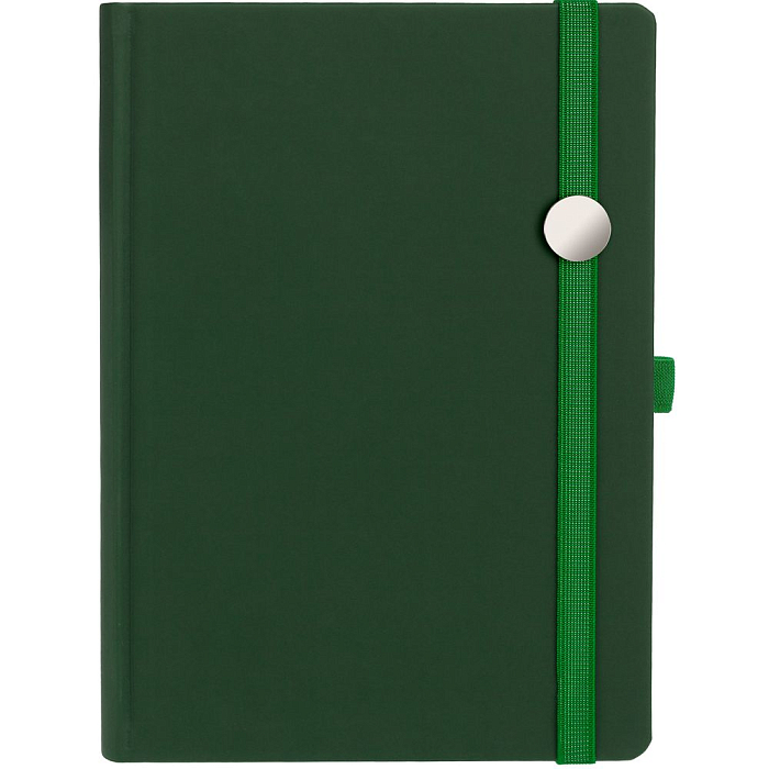 Ежедневник с твердой обложкой без поролона, выполнен из материала Soft Touch, зеленый FF, дополнен резинкой шириной 1 см, петлей-резинкой для ручки, капталом и ляссе в цвет обложки.