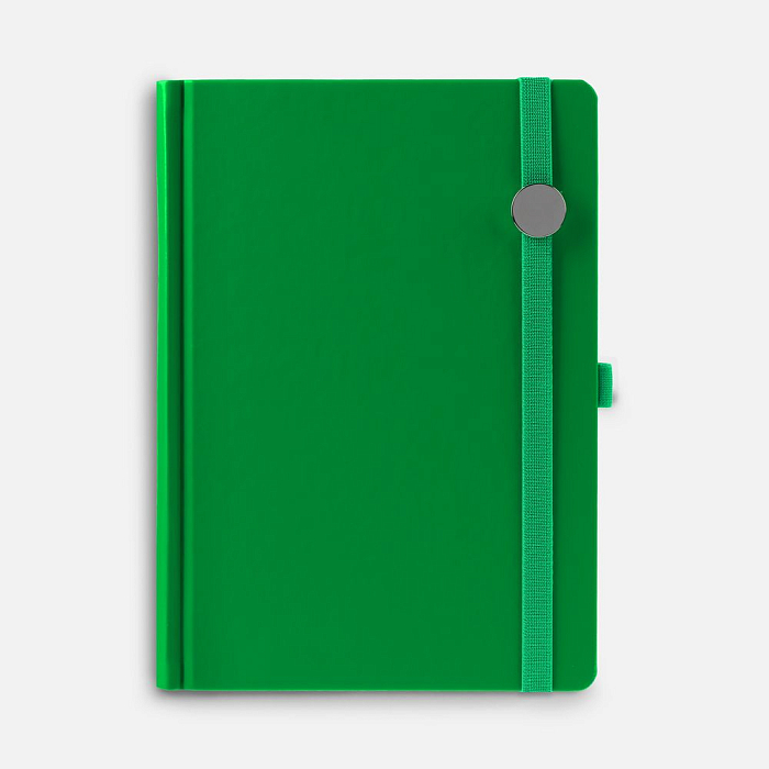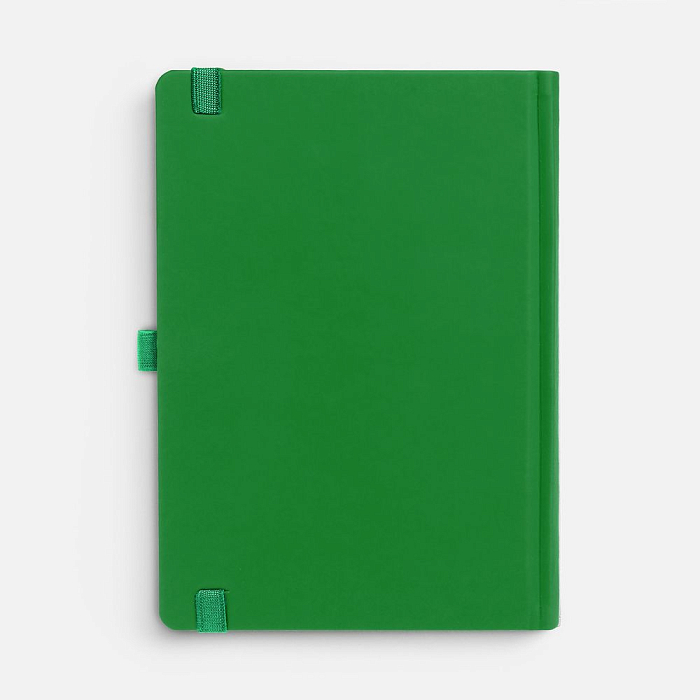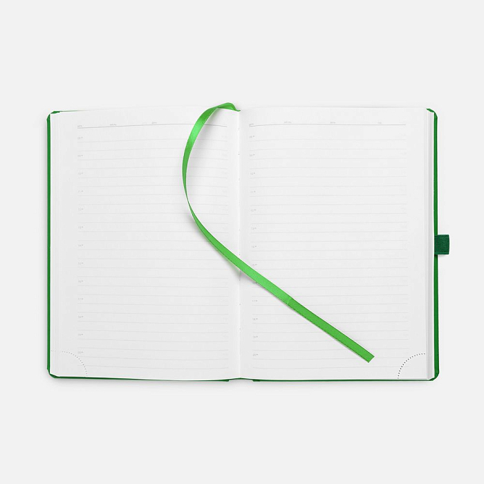 Ежедневник с твердой обложкой без поролона, выполнен из материала Soft Touch Ultra, зеленый FF, дополнен резинкой шириной 1 см, петлей-резинкой для ручки, капталом и ляссе ярко-зеленого цвета.