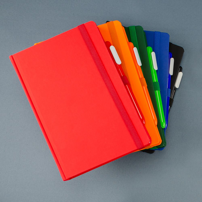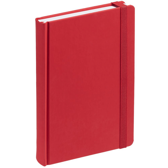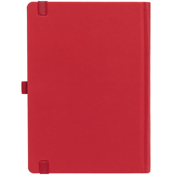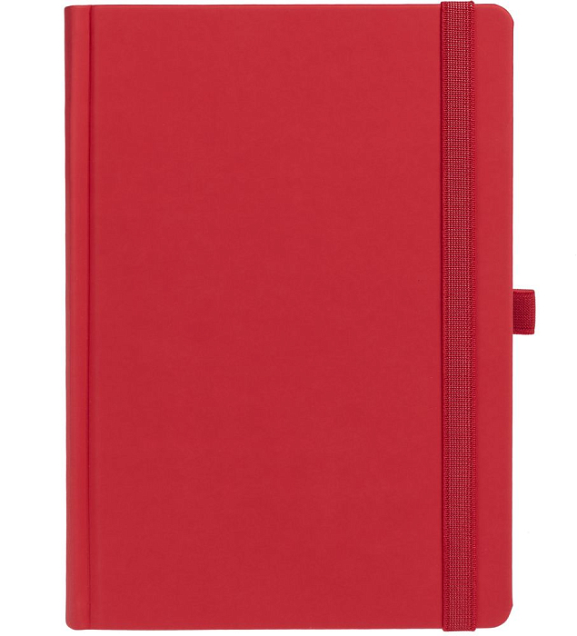 Ежедневник с твердой обложкой без поролона, выполнен из материала Soft Touch Ultra, красный РР, дополнен резинкой шириной 1 см, петлей-резинкой для ручки, капталом и ляссе красного цвета.