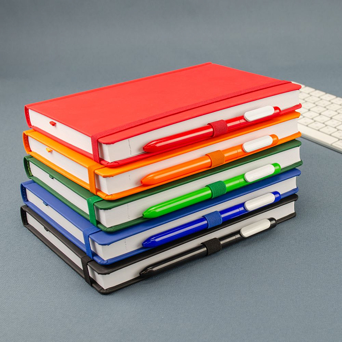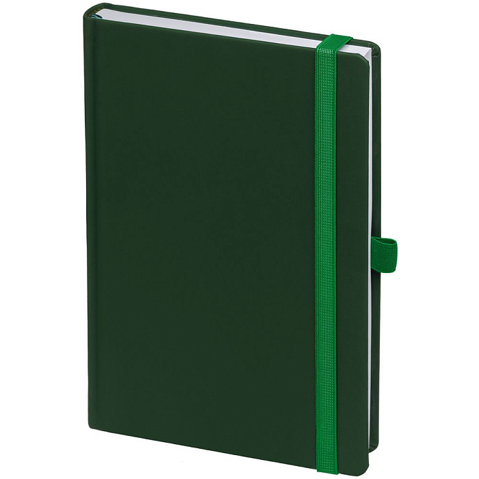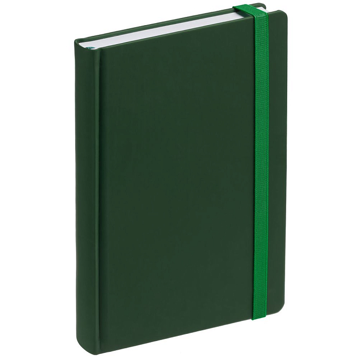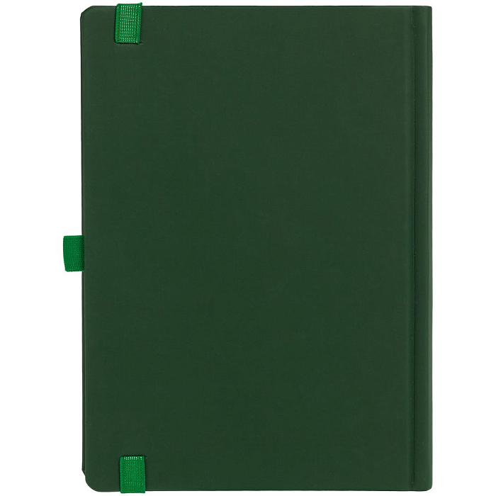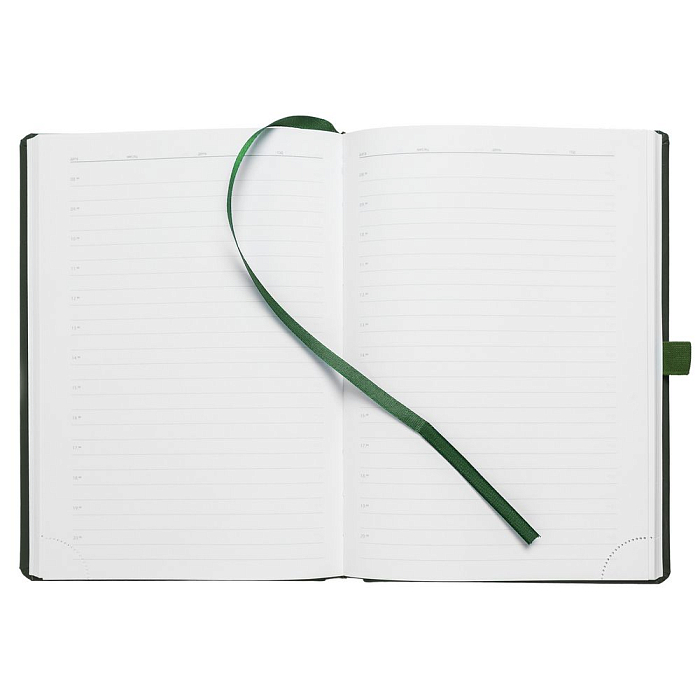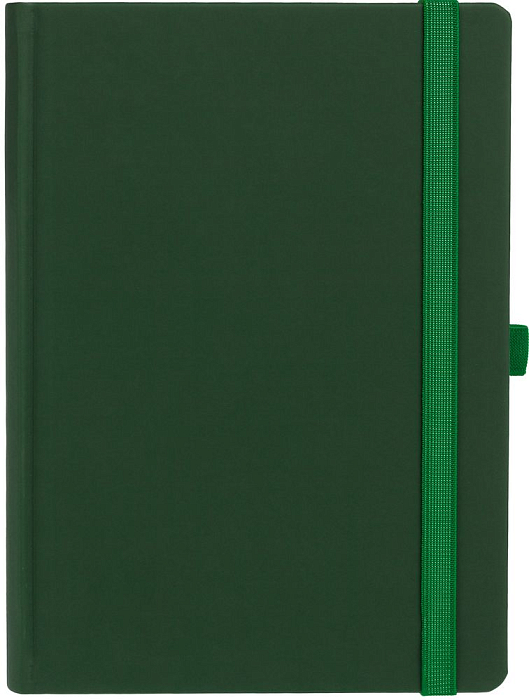 Ежедневник с твердой обложкой без поролона, выполнен из материала Soft Touch, зеленый FF, дополнен резинкой шириной 1 см, петлей-резинкой для ручки, капталом и ляссе в цвет обложки.