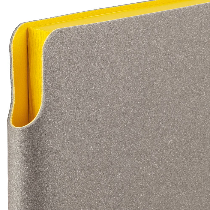 Гибкая обложка выполнена из материала Velour Melange, серый СС и Latte, желтый КК (внутренняя часть обложки). Внутри корешка — специальное место для крепления ручки размером до 15х0,9 см.