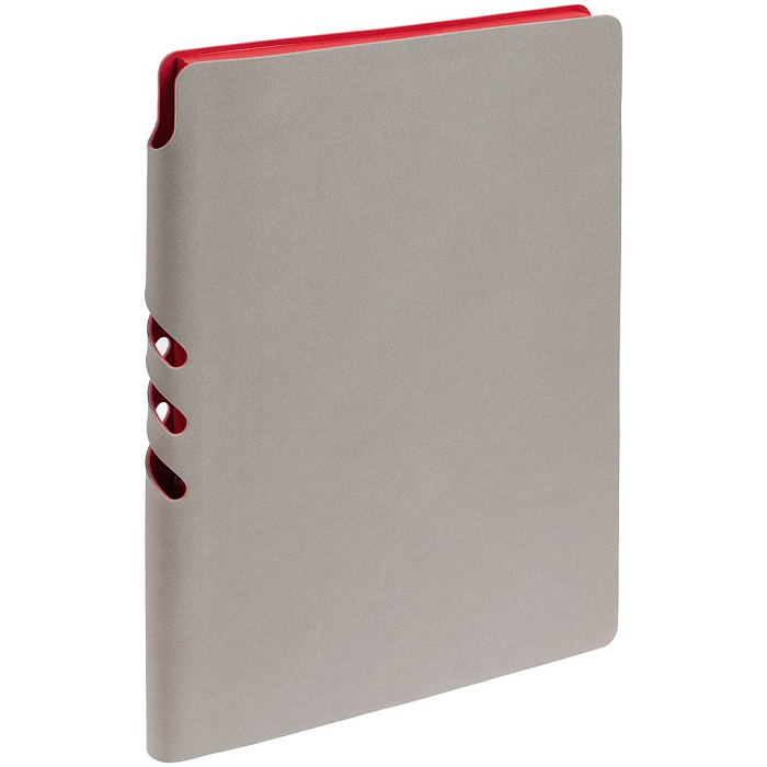 Гибкая обложка выполнена из материала Velour Melange, серый СС и Latte, красный PP (внутренняя часть обложки). Внутри корешка — специальное место для крепления ручки размером до 15х0,9 см.