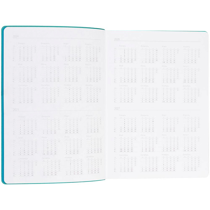 Гибкая обложка выполнена из материала Soft Touch, цвет морской волны II и Latte, цвет морской волны II (внутренняя часть обложки). Внутри корешка — специальное место для крепления ручки размером до 15х1 см.