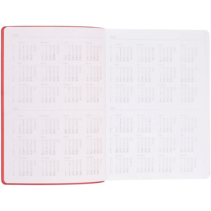 Гибкая обложка выполнена из материала Soft Touch Ultra, красный РР и Latte, красный РР (внутренняя часть обложки). Внутри корешка — специальное место для крепления ручки размером до 15х1 см.