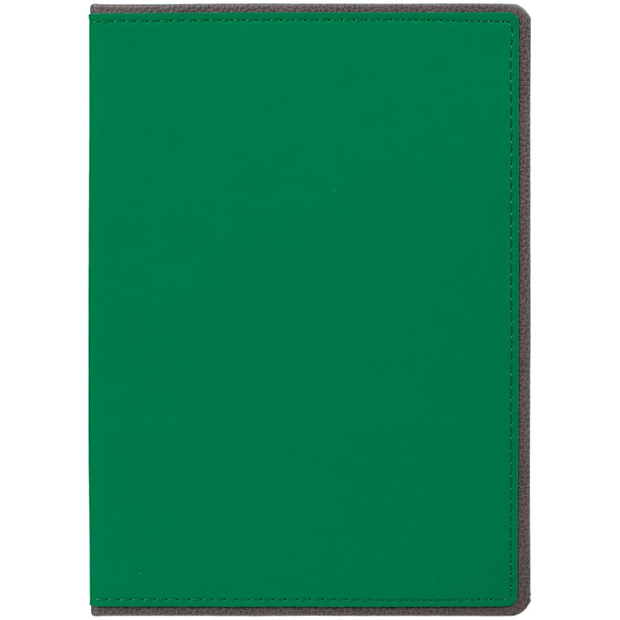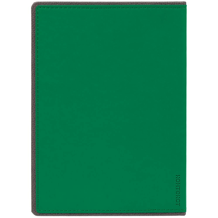 Ежедневник с твердой обложкой, выполнен из материалов Soft Touch Ultra, зеленый FF и La Fite, серый СС. Ляссе темно-серого цвета.