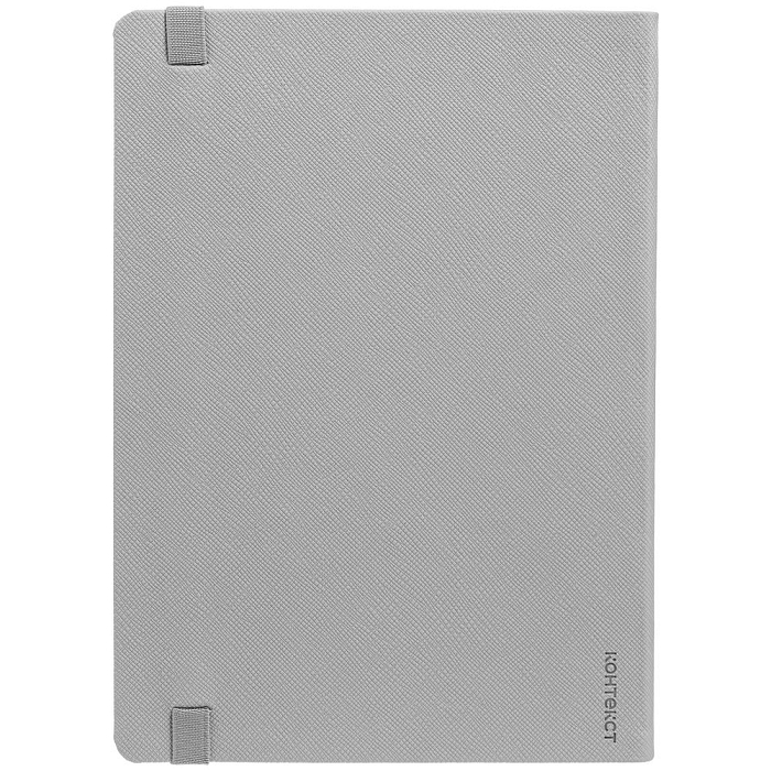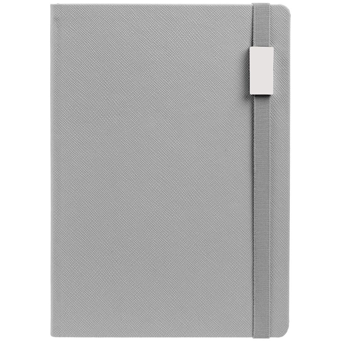 Ежедневник с полутвердой обложкой выполнен из материала Nice Touch, серый СС, и дополнен резинкой шириной 1 см с металлическим шильдом и ляссе серого цвета.
