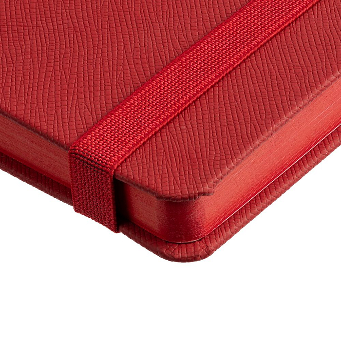 Ежедневник с полутвердойобложкой выполнен из материала Nice Touch, красный PP, и дополнен резинкой шириной 1 см с металлическим шильдом и ляссе красного цвета.