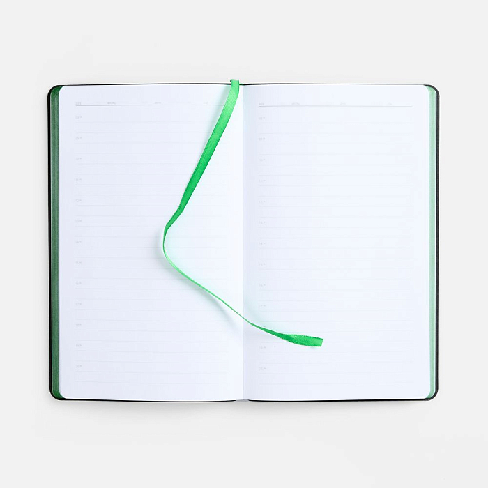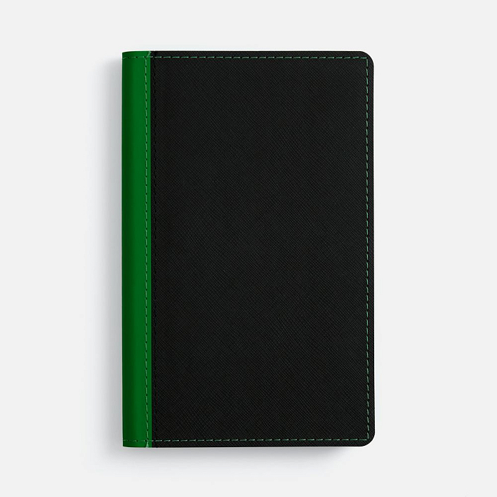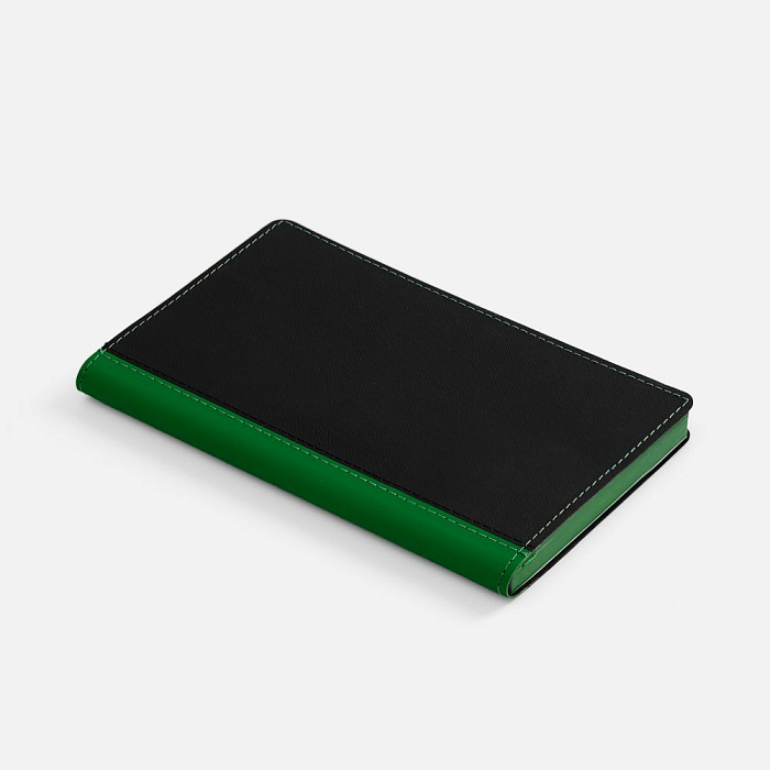 Ежедневник с гибкой обложкой выполнен из материала Nice Touch, черный АА и Soft Touch Ultra, зеленый FF, дополнен ляссе зеленого цвета.