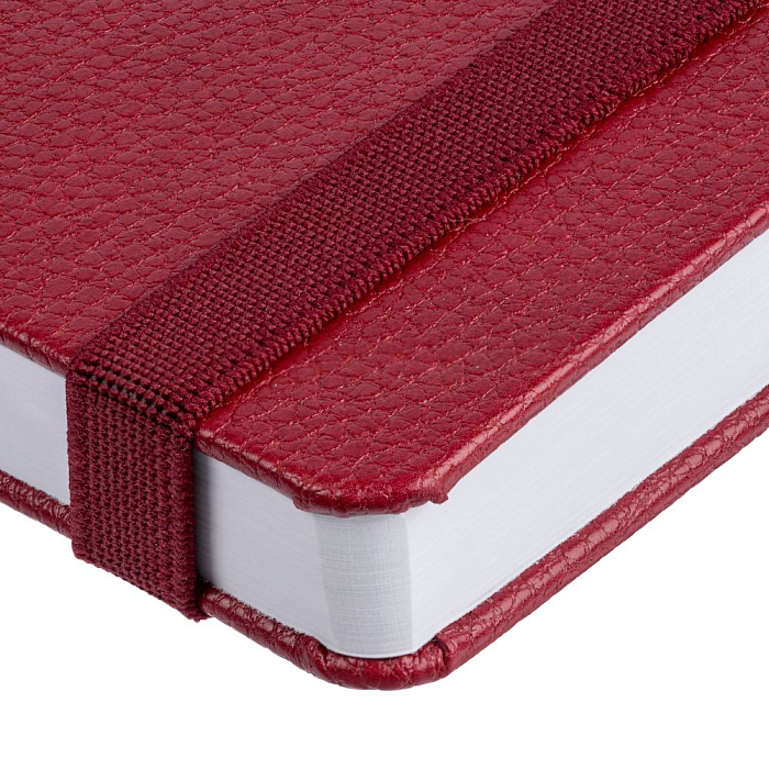 Ежедневник с твердой обложкой, выполнен из материала LaFite, красный РР, дополнен резинкой с металлическим прямоугольным шильдом и ляссе в цвет обложки.
