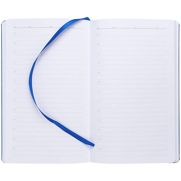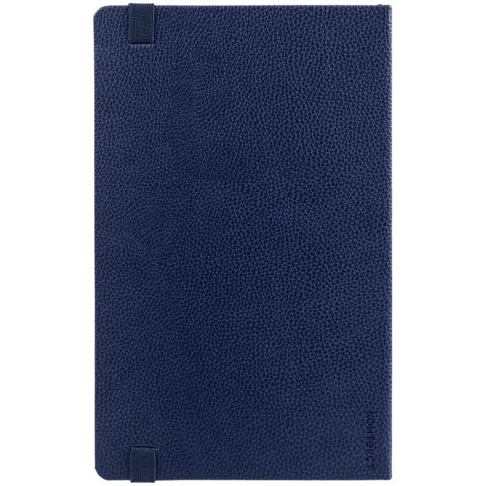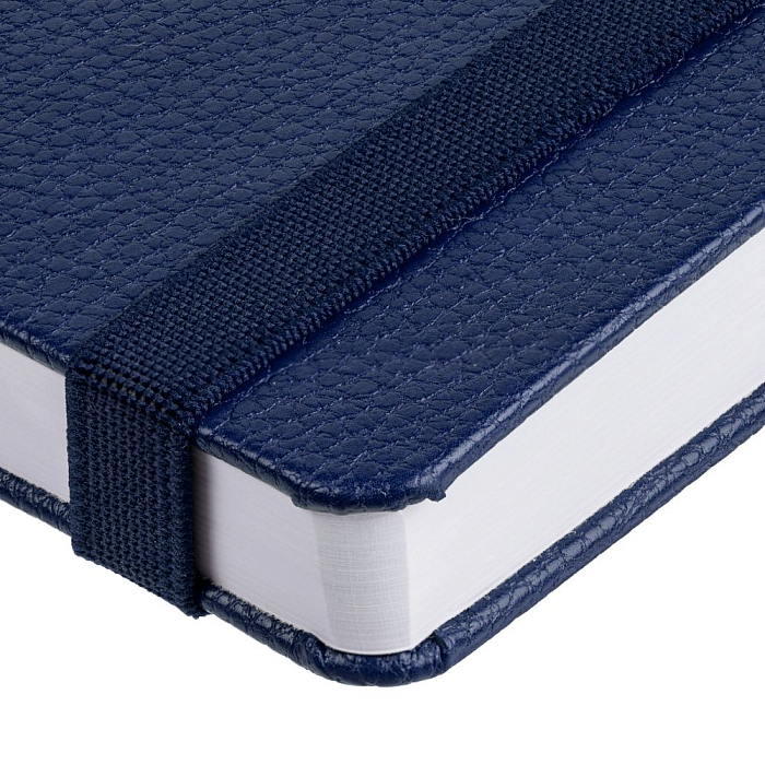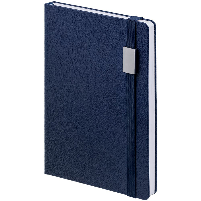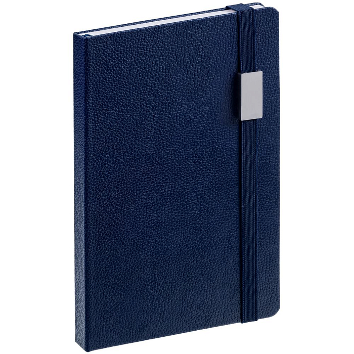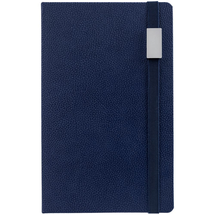 Ежедневник с твердой обложкой, выполнен из материала LaFite, темно-синий ХХ, дополнен резинкой с металлическим прямоугольным шильдом и ляссе в цвет обложки.