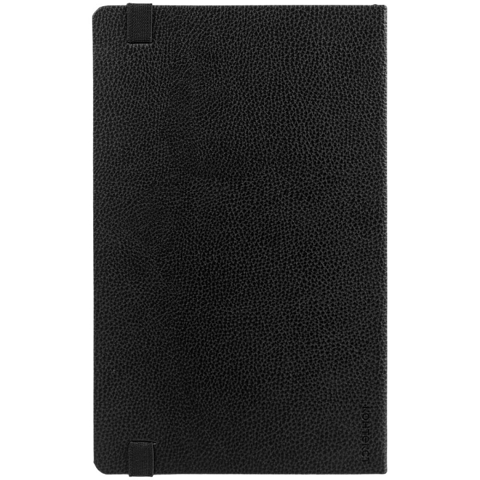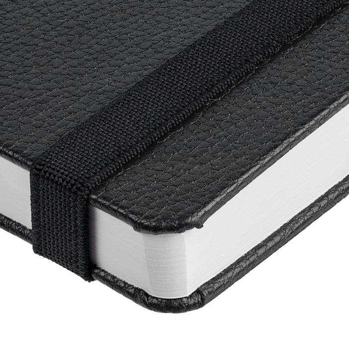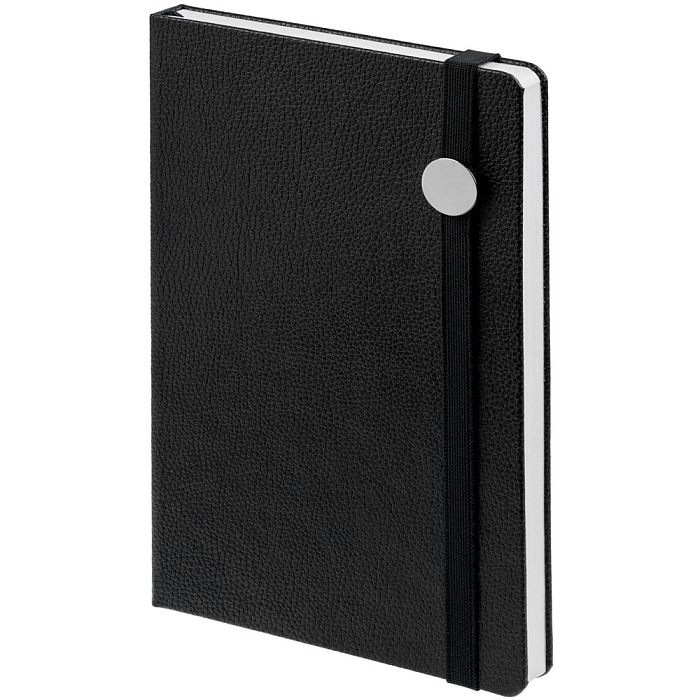 Ежедневник с твердой обложкой, выполнен из материала LaFite, черный АА, дополнен резинкой с металлическим круглым шильдом и ляссе в цвет обложки.