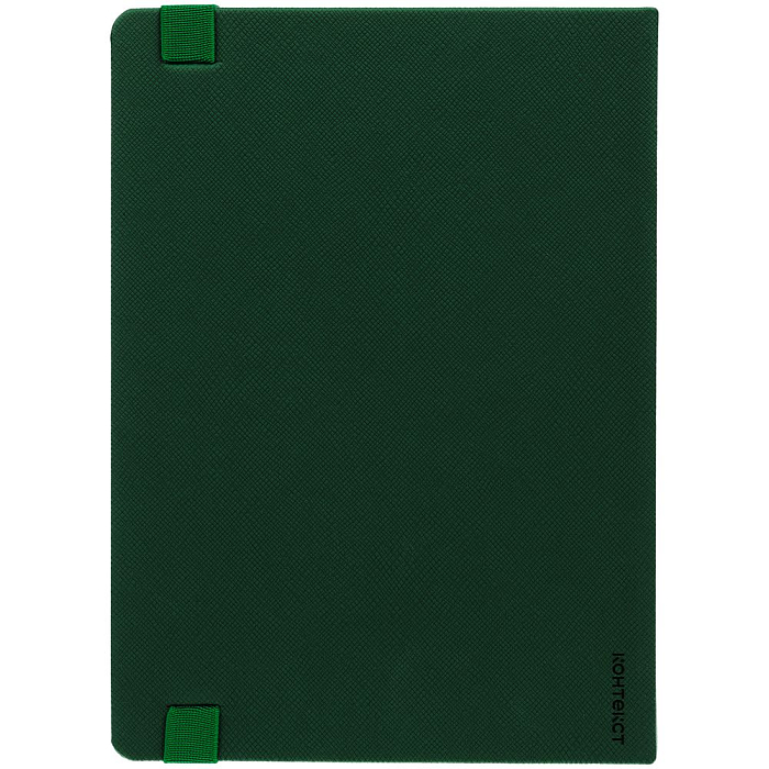 Ежедневник с твердой обложкой, выполнен из материала Nice Touch, зеленый FF, дополнен резинкой с лейблом из материала Soft Touch и ляссе в цвет обложки.