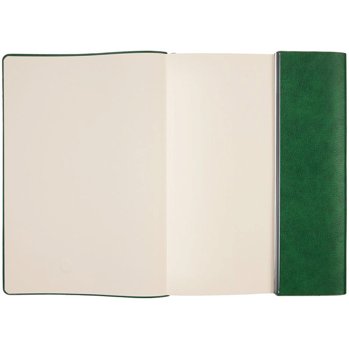 Ежедневник с гибкой обложкой, клапаном на магните и металлической отделкой клапана. Выполнен из материала Petrus, зеленый FF, дополнен серым ляссе.