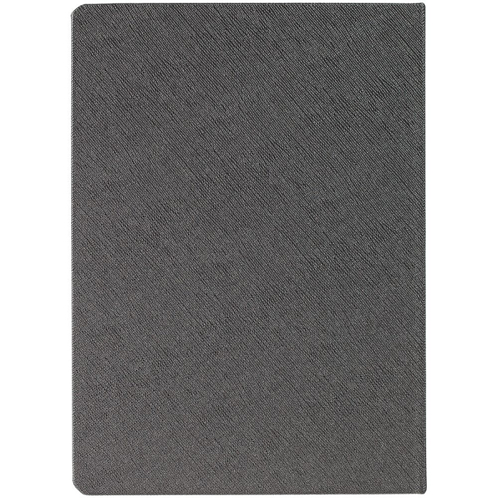 Ежедневник с твердой обложкой и серебристым обрезом, выполнен из материала Saffian, темно-серый, дополнен ляссе в цвет обложки.