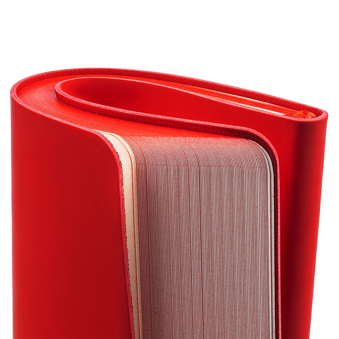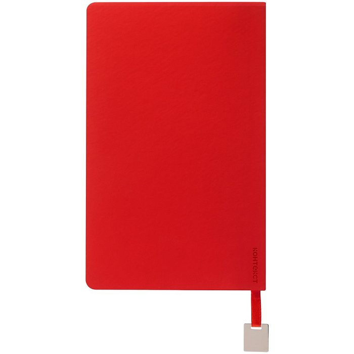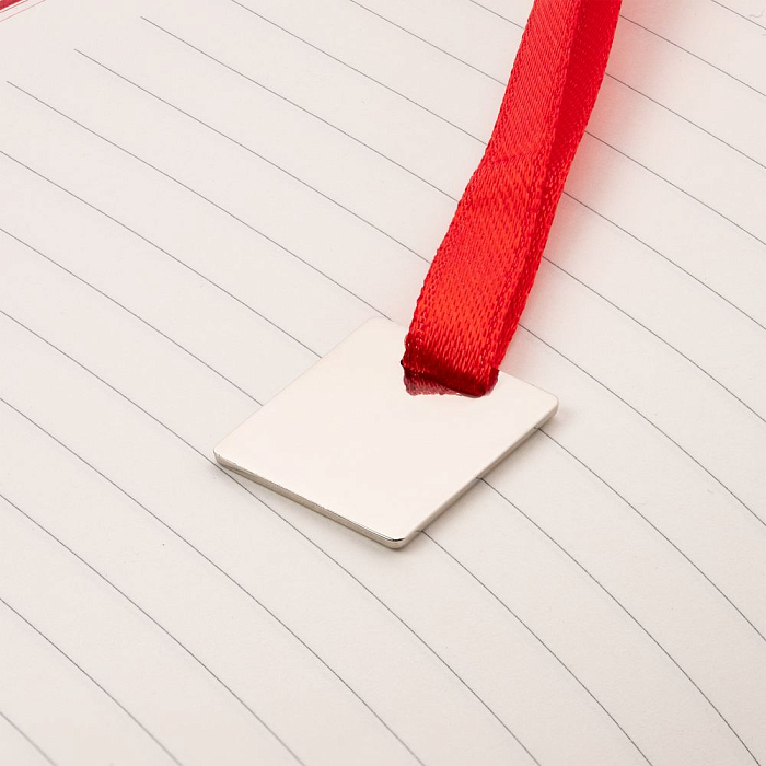 Ежедневник с гибкой обложкой, выполнен из материалов Soft Touch Ultra, красный РР, и Latte, красный (внутренняя часть обложки), дополнен ляссе в цвет обложки с металлическим шильдиком.