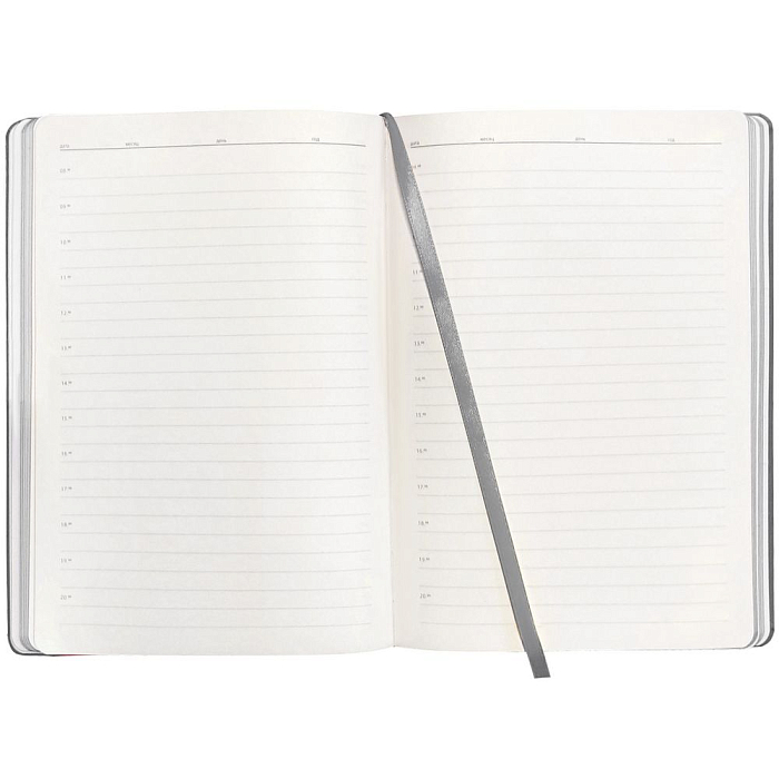 Ежедневник с гибкой обложкой, выполнен из материалов Soft Touch Pearl, серый СС, и Latte, серый (внутренняя часть обложки), дополнен ляссе в цвет обложки с металлическим шильдиком.