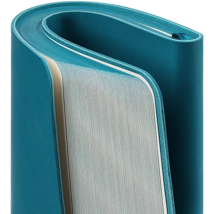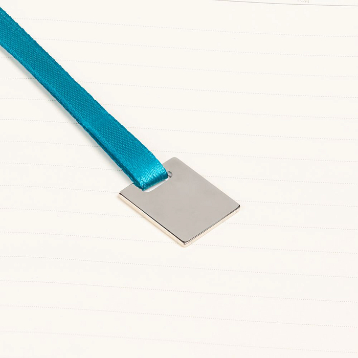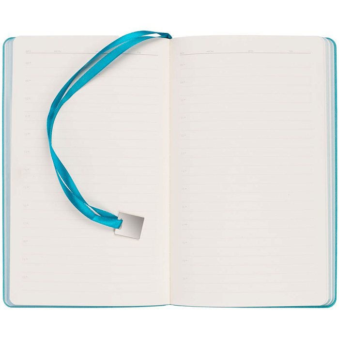 Ежедневник с гибкой обложкой, выполнен из материалов Soft Touch, цвет морской волны II, и Latte, цвет морской волны (внутренняя часть обложки), дополнен ляссе в цвет обложки с металлическим шильдиком.