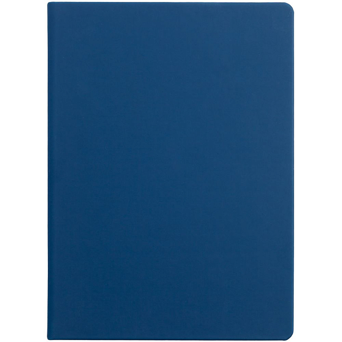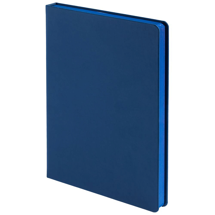 Ежедневник с твердой обложкой и тонированным обрезом, выполнен из материала Soft Touch, синий НН, дополнен ляссе в цвет обложки.