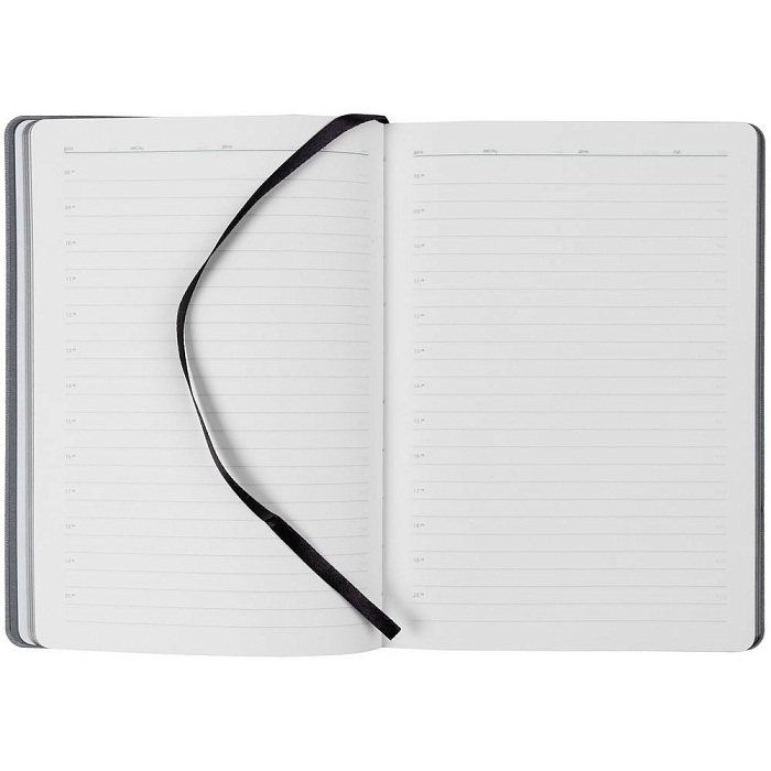 Ежедневник с гибкой обложкой, выполнен из материала Nebraska, черный АА и Latte. серый СС, дополнен ляссе в цвет обложки.