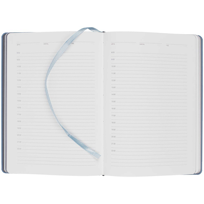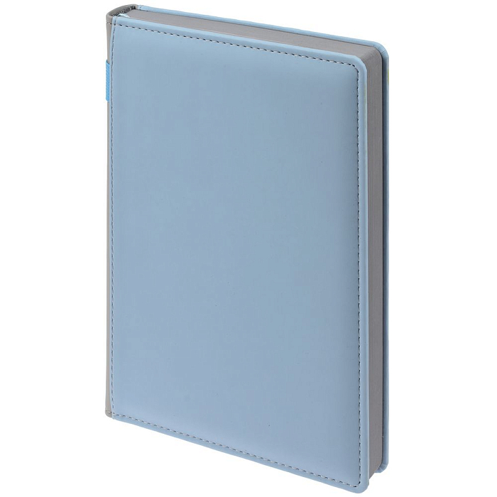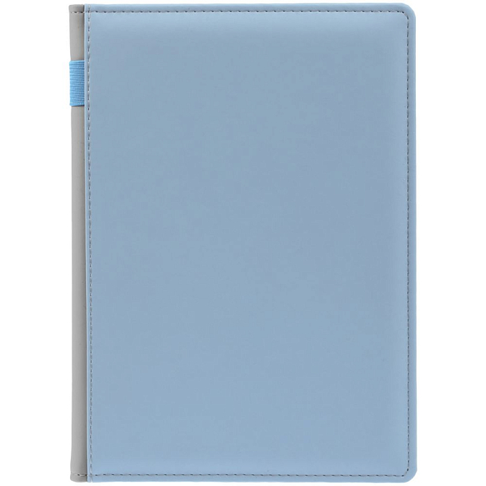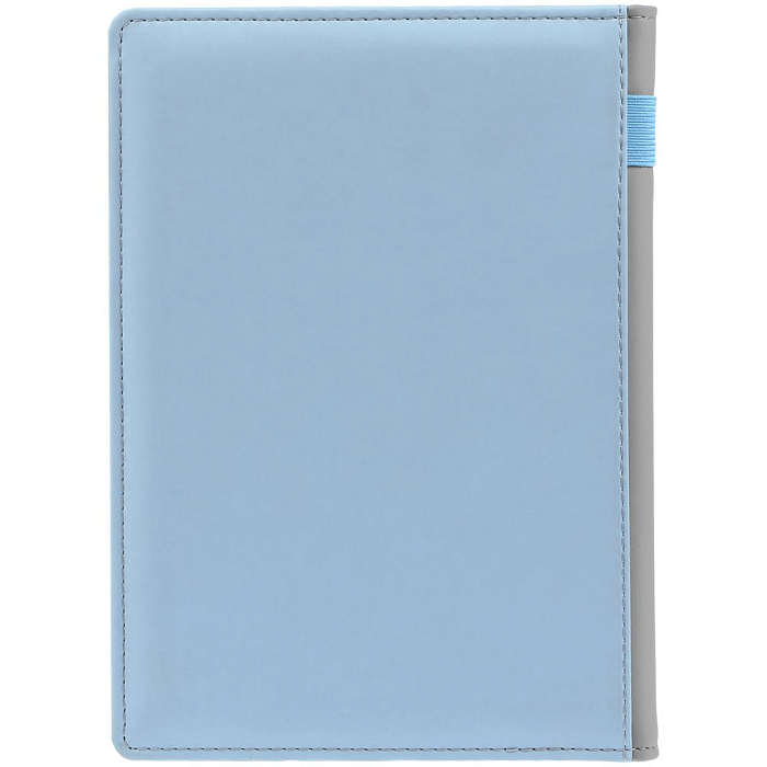 Твердая обложка с поролоном, материал обложки — Soft Touch, голубой JJ и Soft Touch, серый СС. На корешке ежедневника находится петля из резинки.