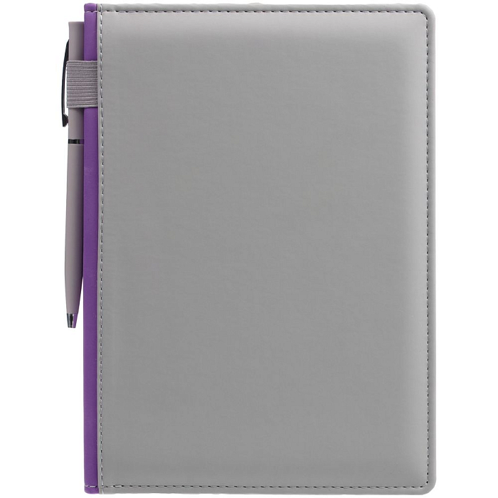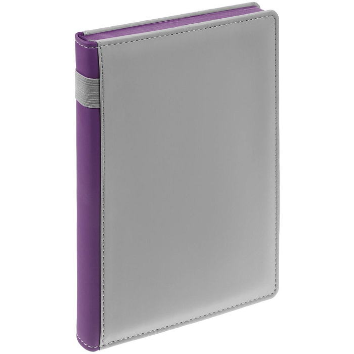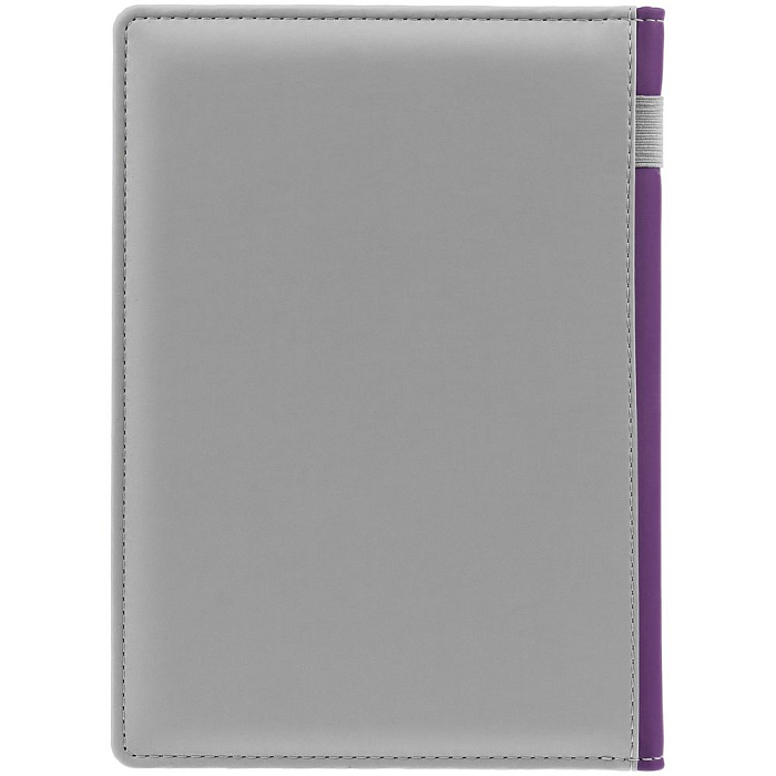 Твердая обложка с поролоном, материал обложки — Soft Touch, серый СС и Soft Touch, фиолетовый UU. На корешке ежедневника находится петля из резинки.