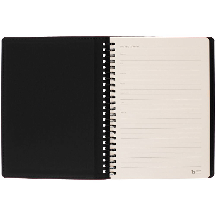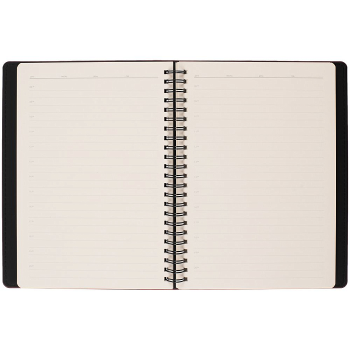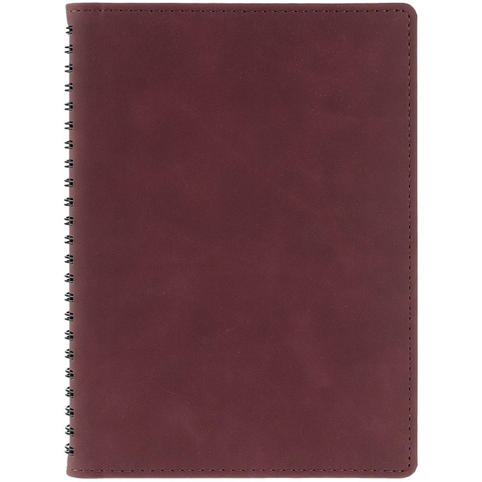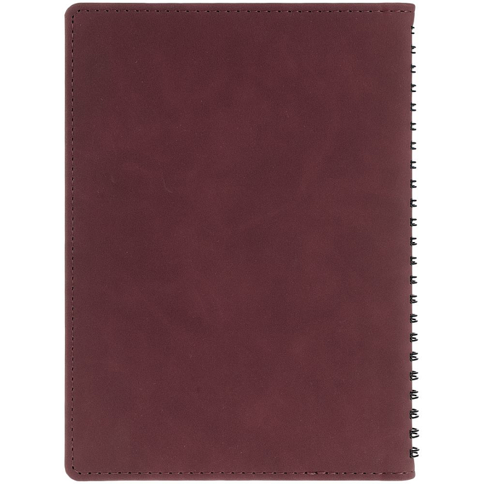 Ежедневник с блоком на пружине в твердой обложке, выполнен из материалов Nubuk Touch, винный SS и Soft Touch, черный AA.