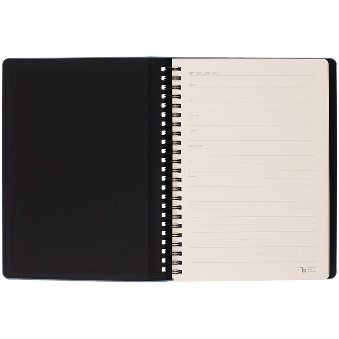 Ежедневник с блоком на пружине в твердой обложке, выполнен из материалов Nubuk Touch, голубой JJ и Soft Touch, черный AA.