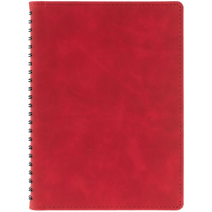 Ежедневник с блоком на пружине в твердой обложке, выполнен из материалов Nubuk Touch, красный PP и Soft Touch, черный AA.