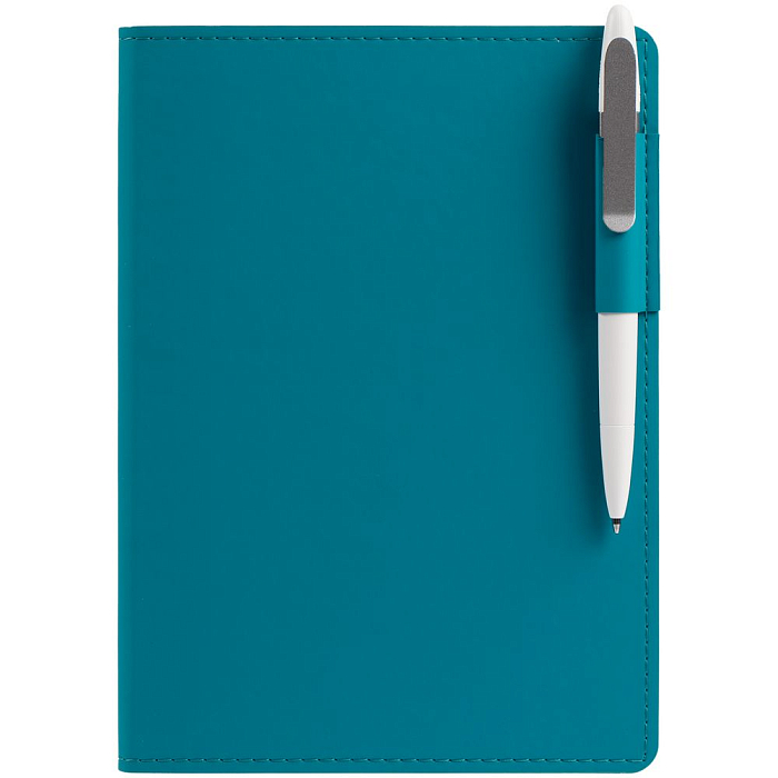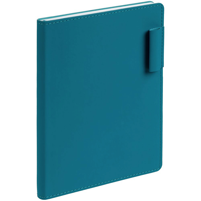 Ежедневник с гибкой обложкой из материала Soft Touch, цвет морской волны II и Latte, морская волна (внутренний материал), дополнен петелькой для ручки из покровного материала, капталом, ляссе и закрашенным срезом обложки в цвет материала.
