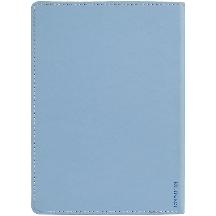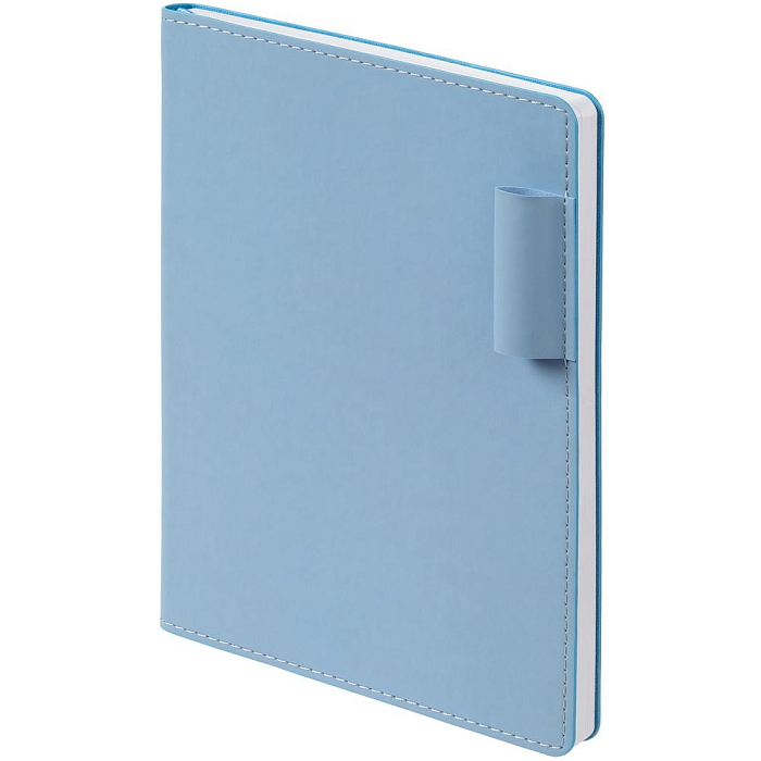 Ежедневник с гибкой обложкой из материала Soft Touch, голубой и Latte, голубой (внутренний материал), дополнен петелькой для ручки из покровного материала, капталом, ляссе и закрашенным срезом обложки в цвет материала.