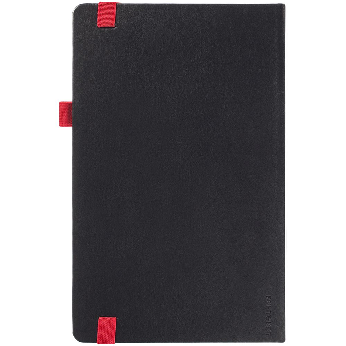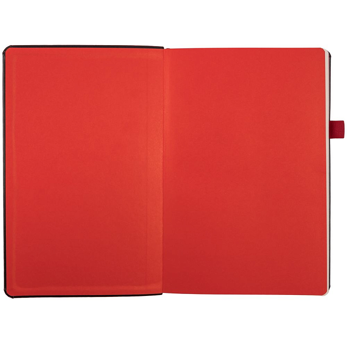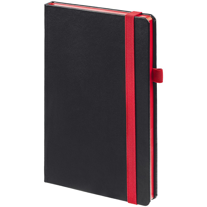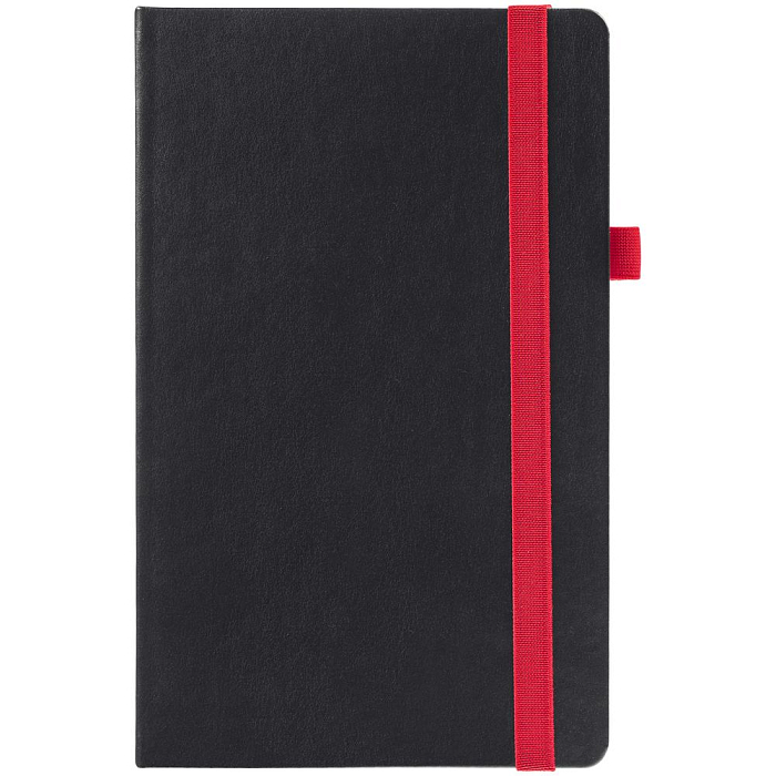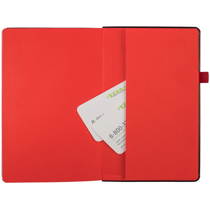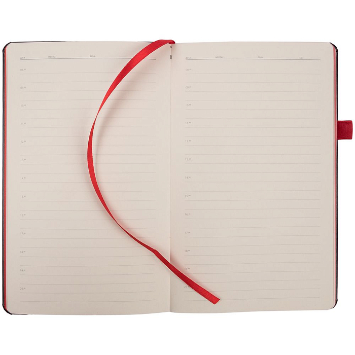 Ежедневник с твердой обложкой, выполнен из материала Waltz, черный АА, дополнен красными резинкой и ляссе.