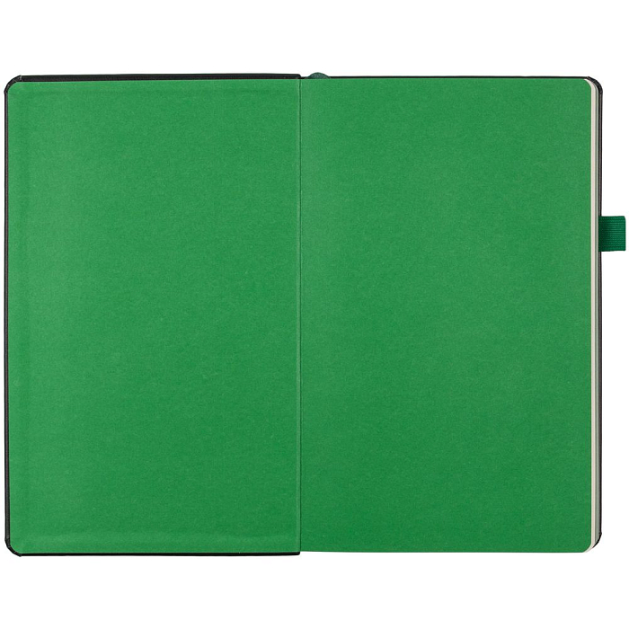 Ежедневник с твердой обложкой, выполнен из материала Waltz, черный АА, дополнен зеленой резинкой и ляссе.