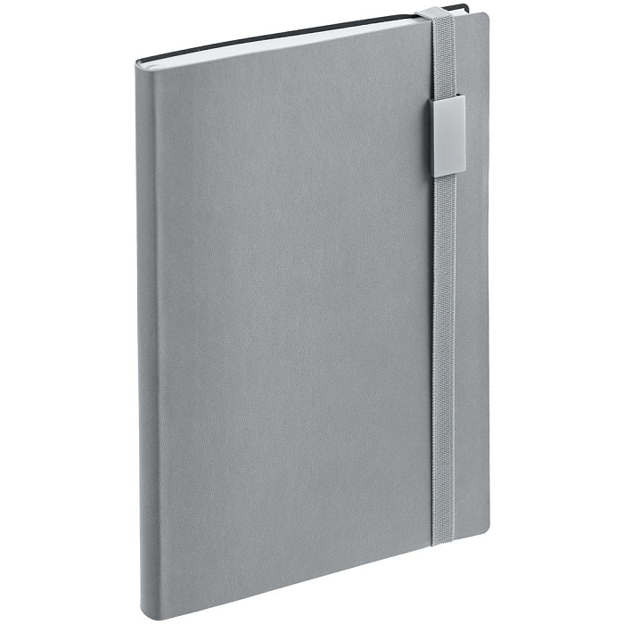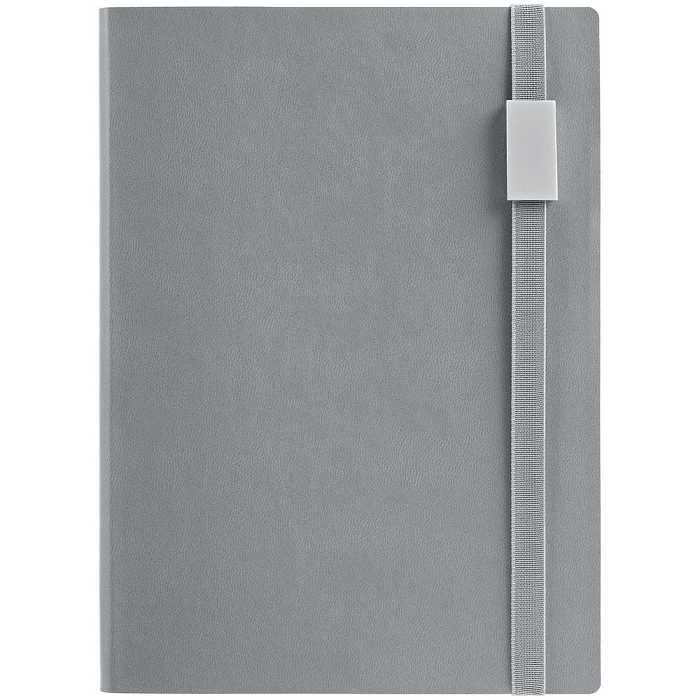 Ежедневник с гибкой обложкой, выполнен из материала Latte, серый CC, дополнен резинкой шириной 1 см с металлическим шильдом, капталом и ляссе серого цвета.