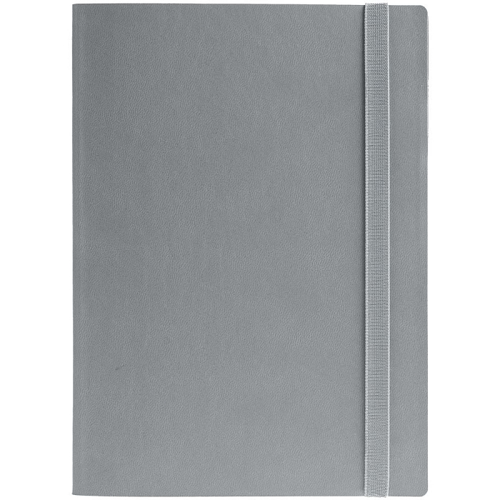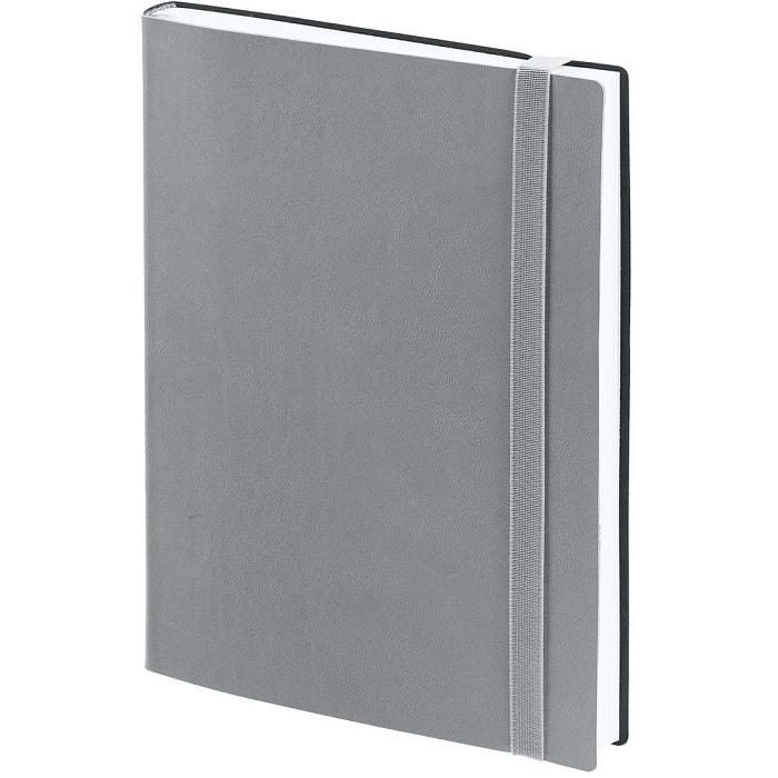 Ежедневник с гибкой обложкой выполнен из материала Latte, серый СС, и дополнен резинкой шириной 1 см, капталом и ляссе серого цвета.