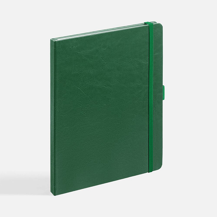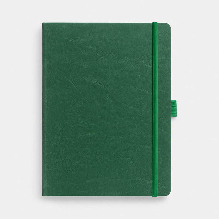 Еженедельник в твердой обложке выполнен из материала Nebraska, зеленый FF, дополнен резинкой, петлей для ручки и ляссе зеленого цвета.