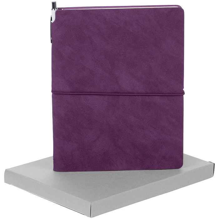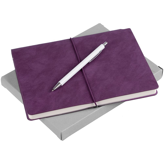 Ежедневник из искусственного материала, напоминающего замшу, и изящная ручка, которая удобно прячется за обложку ежедневника.