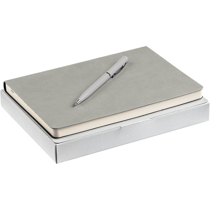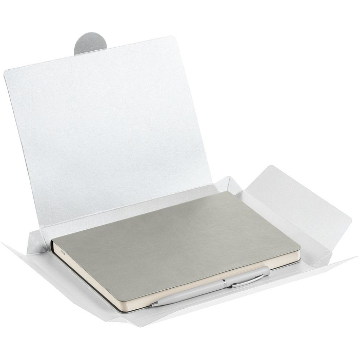 Недатированный ежедневник с гибкой обложкой из материала Latte с ляссе в цвет обложки, а также ручка в тон — в подарочной коробке из дизайнерского картона.