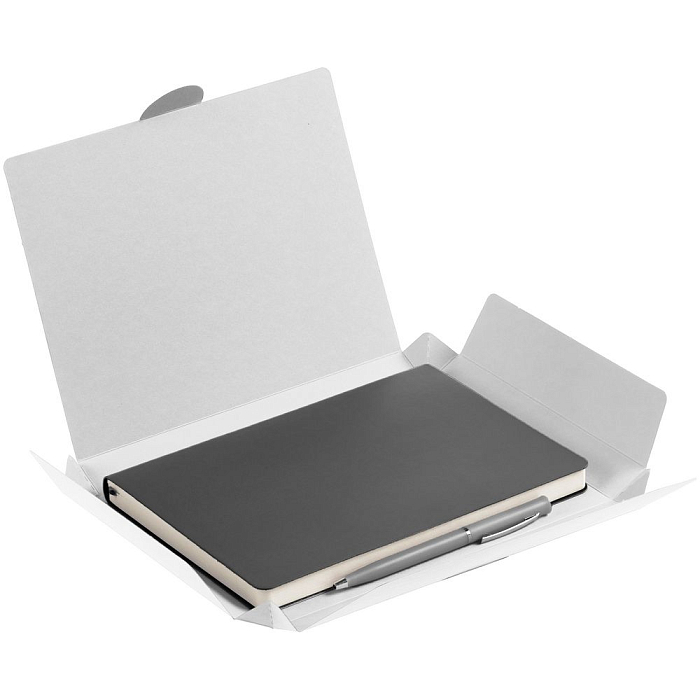 Недатированный ежедневник с гибкой обложкой из материала Latte с ляссе в цвет обложки, а также ручка в тон — в подарочной коробке из дизайнерского картона.