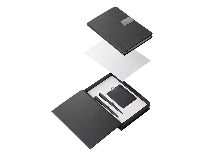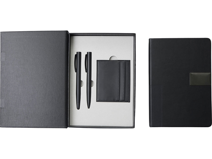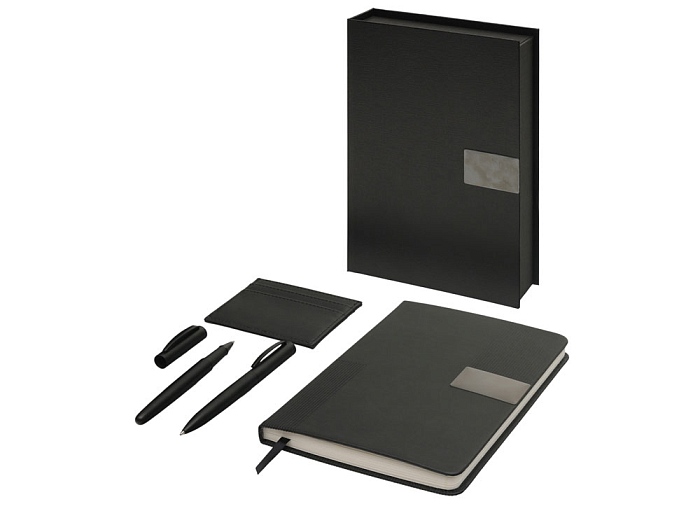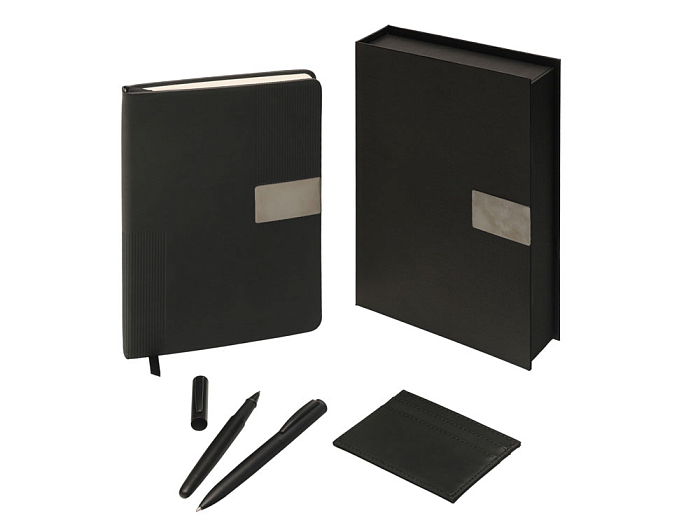 "Goethe" - это премиальный подарочный набор в коробке, закрывающейся на магнит. Комплект включает две ручки — шариковую и роллер — с высококачественными синими немецкими чернилами Dokumental и пишущими узлами Premec (в шариковой). Их дополняет картхолдер из экокожи на 4 карты с отделением для наличности. Завершает этот комплект блокнот в твердой обложке из искусственной кожи. Внутри него 96 листов кремовой бумаги с FSC-сертификатом плотностью 80 г/м2.